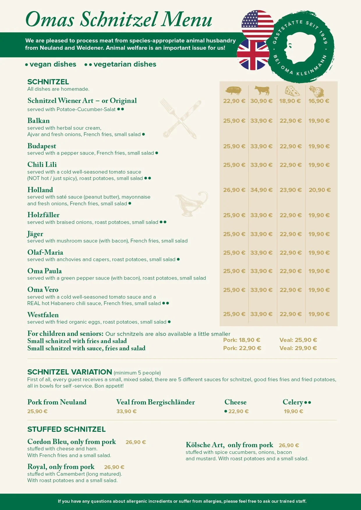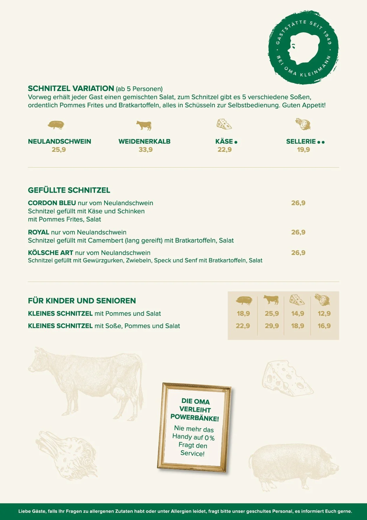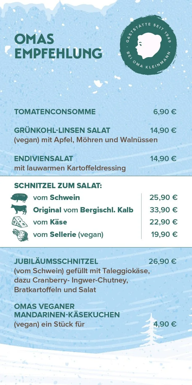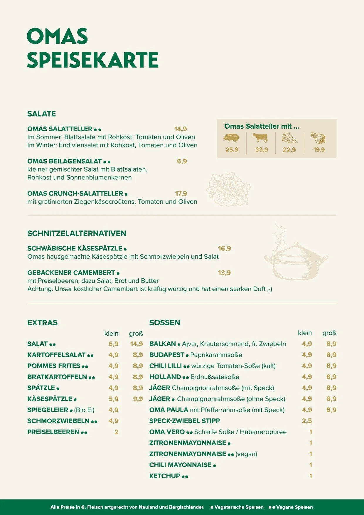 Die Oma freut sich, dem Wunsch der Gäste nach authentischem Genuss zu fairen Preisen nachkommen zu können. Ob saisonale Gerichte, überlieferte Rezepte von Paula Kleinmann, Spezialitäten aus Köln und der Eifel oder Vorschläge unserer Gäste, eines ist sicher: Unsere Lust am Kochen, Beisammensein und Essen teilen wir gerne mit Euch.