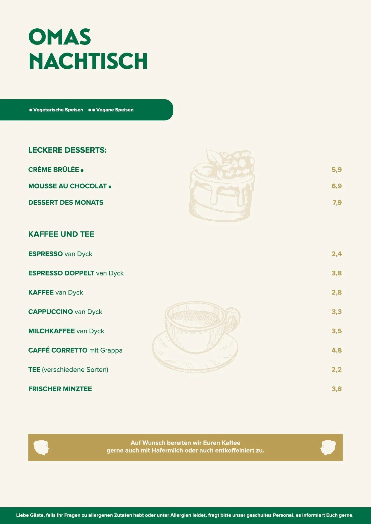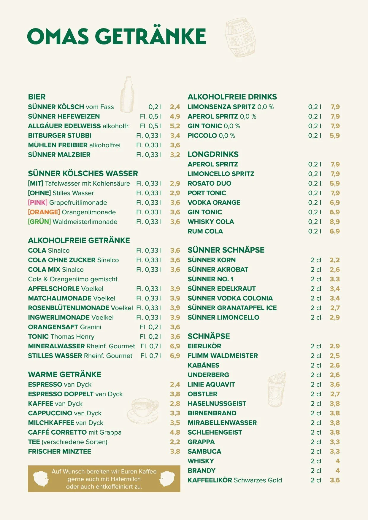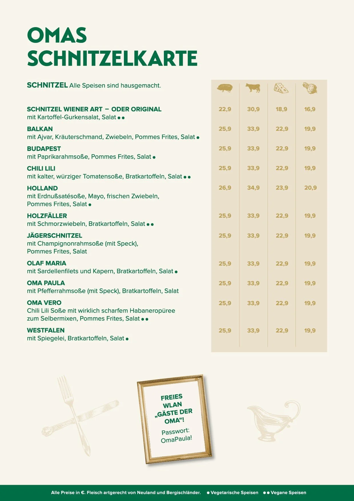 Die Oma freut sich, dem Wunsch der Gäste nach authentischem Genuss zu fairen Preisen nachkommen zu können. Ob saisonale Gerichte, überlieferte Rezepte von Paula Kleinmann, Spezialitäten aus Köln und der Eifel oder Vorschläge unserer Gäste, eines ist sicher: Unsere Lust am Kochen, Beisammensein und Essen teilen wir gerne mit Euch.
